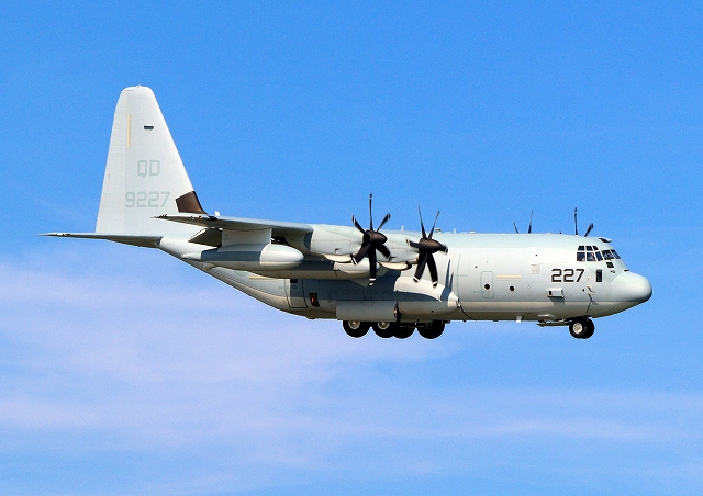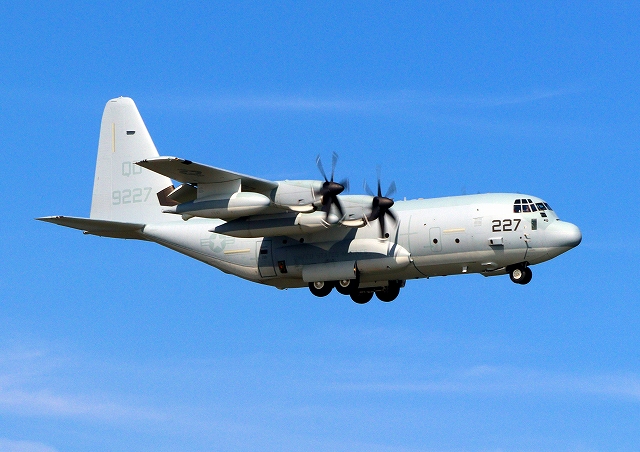 米海兵隊 KC-130J 空中給油機 スーパーハーキュリーズ(岩国基地)、QD 9227番機が旋回 |