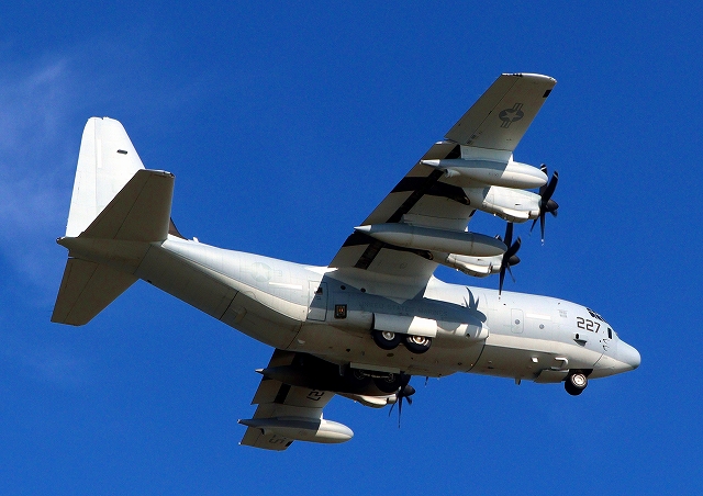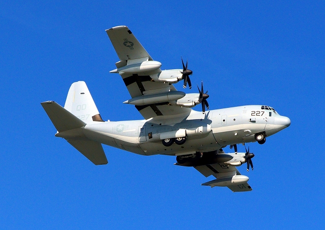 米海兵隊 KC-130J 空中給油機 スーパーハーキュリーズ(岩国基地)、QD 9227番機が旋回 |