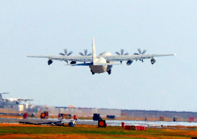 米海兵隊 KC-130J 空中給油機 スーパーハーキュリーズ(岩国基地)、QD 9380番機が離陸 |