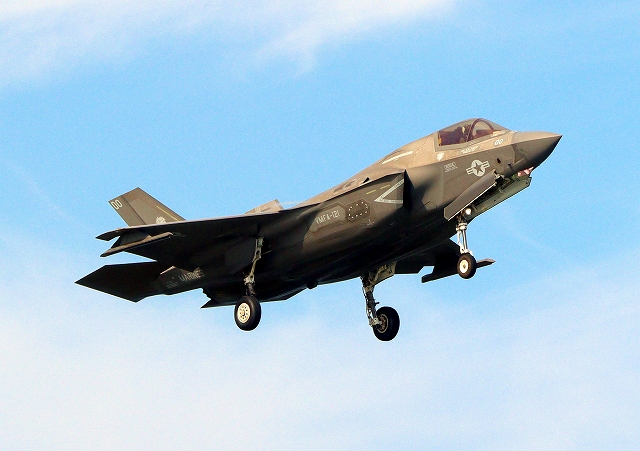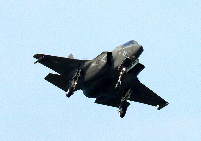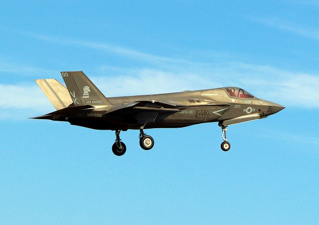 米海兵隊 F-35B ライトニングⅡ 戦闘機(岩国基地)、VK、00番機が短距離着陸 |