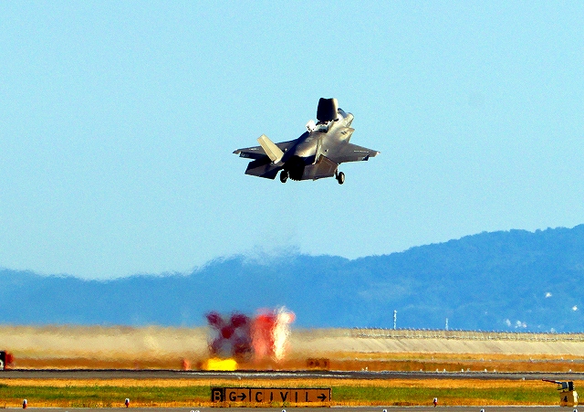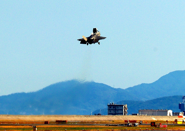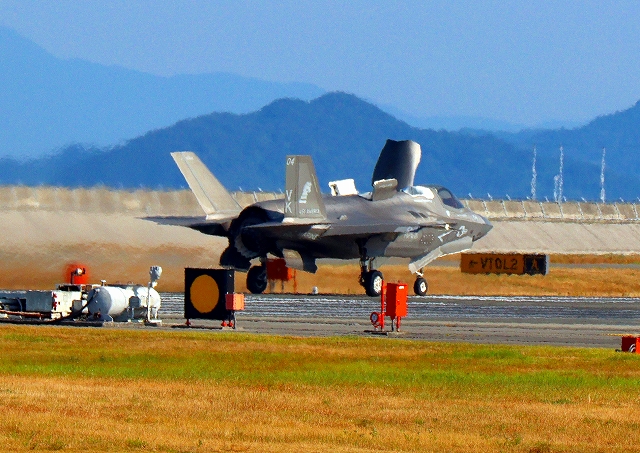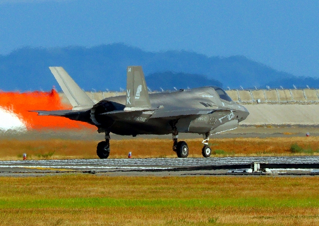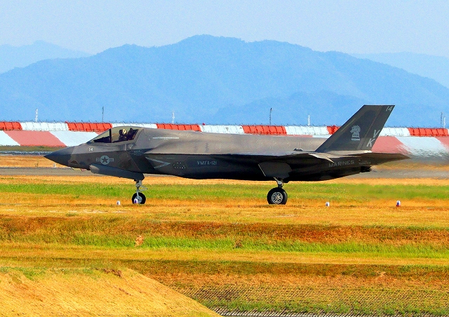 米海兵隊 F-35B ライトニングⅡ 戦闘機(岩国基地)、VK、14番機が離陸 |