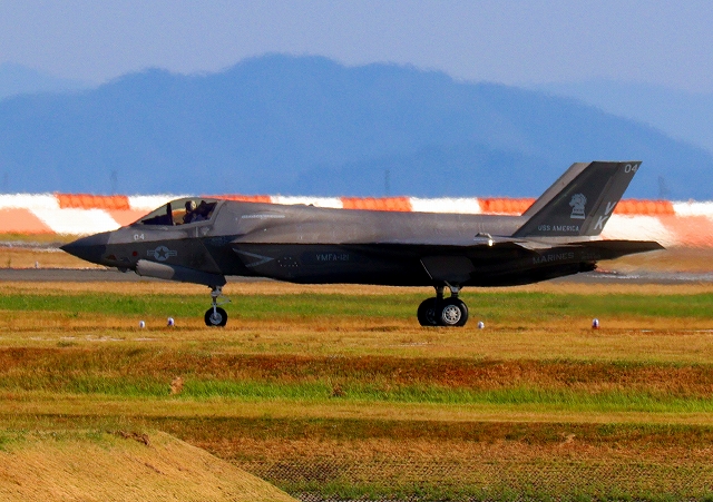 米海兵隊 F-35B ライトニングⅡ 戦闘機(岩国基地)、VK、04番機が短距離離陸 |