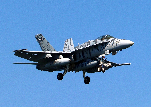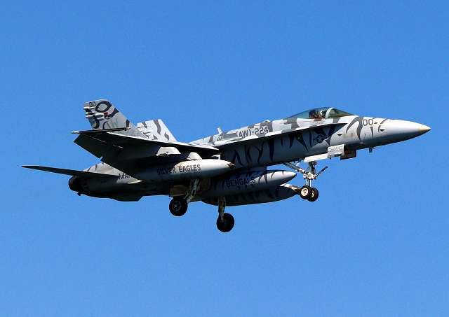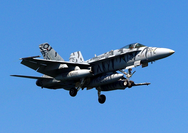 米海兵隊 F/A-18C ホーネット 戦闘攻撃機(岩国基地)、WK、00番機が着陸 |