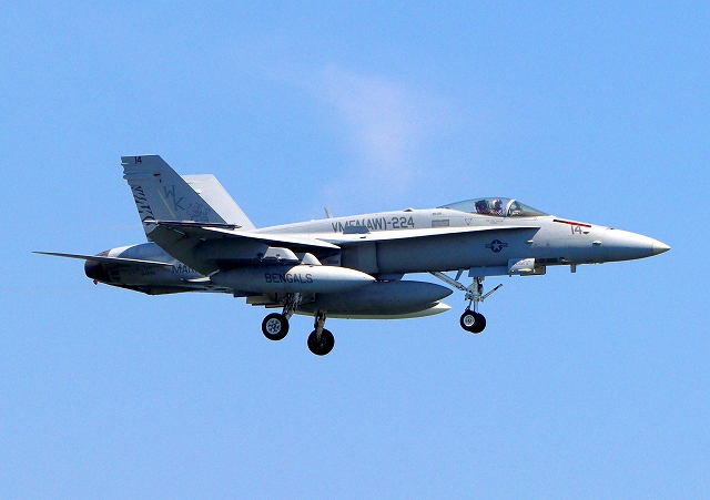 米海兵隊 F/A-18C ホーネット 戦闘攻撃機(岩国基地)、WK、14番機が着陸 |