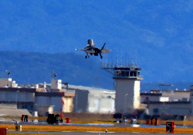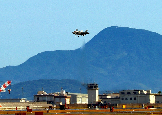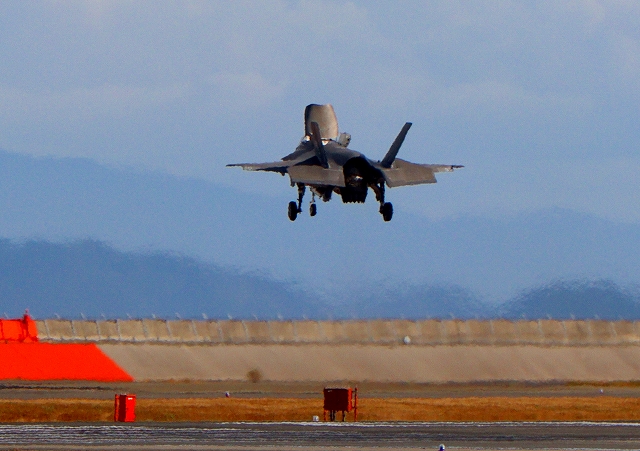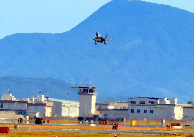 米海兵隊 F-35B ライトニングⅡ 戦闘機(岩国基地)、VK、00番機が帰還 垂直着陸パッドの上でホバリング |