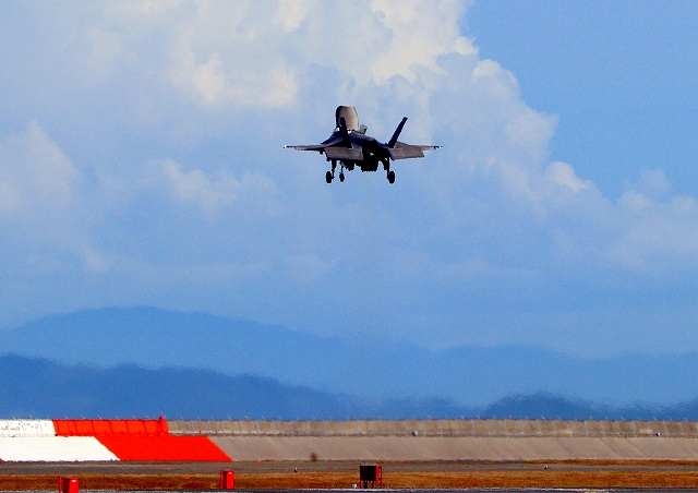 米海兵隊 F-35B ライトニングⅡ 戦闘機(岩国基地)、VK、04番機が、新しい垂直着陸パッドの上でホバリング このあと着陸 |