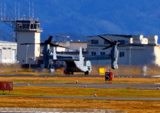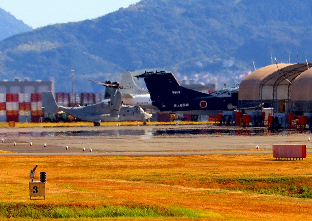 米海兵隊 MV-22B オスプレイ、YW、04番機が外来機駐機場から出てきました。 |