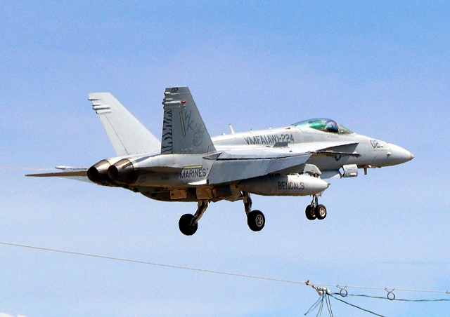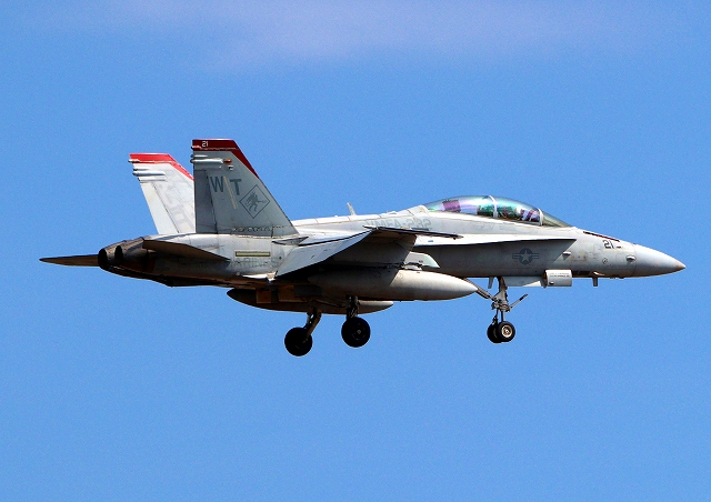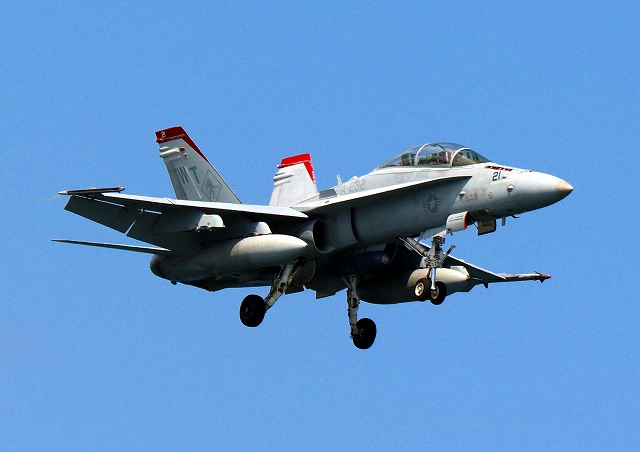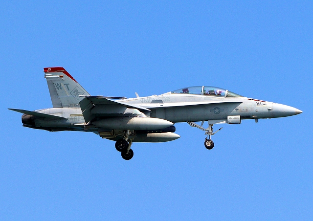 米海兵隊 F/A-18D ホーネット 戦闘攻撃機(岩国基地)、WT、21番機が着陸 |