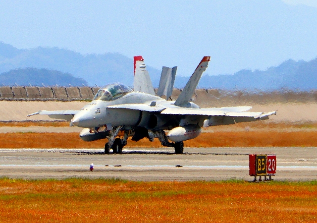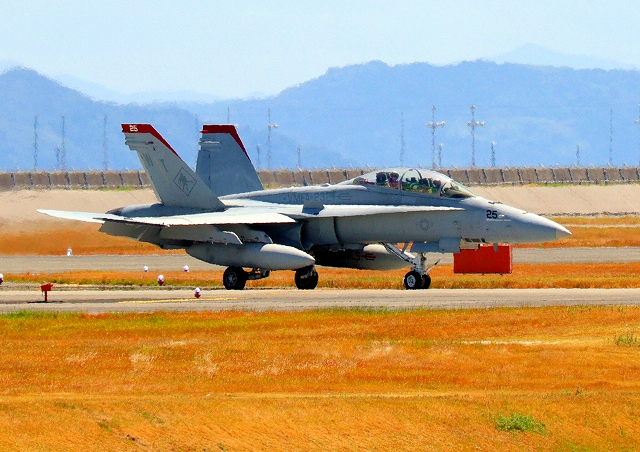 米海兵隊 F/A-18D ホーネット 戦闘攻撃機(岩国基地)、WT、25番機が着陸 |