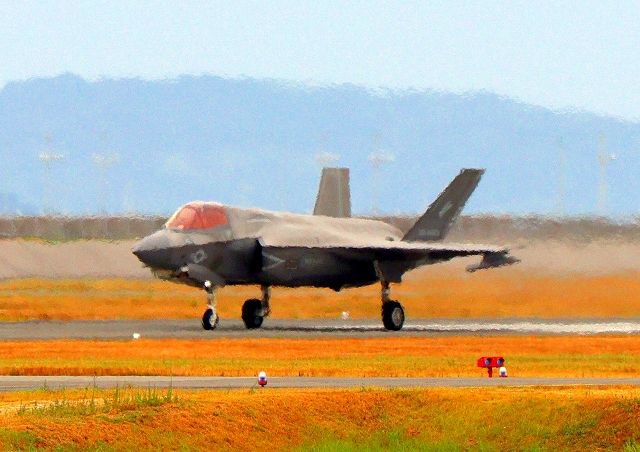 米海兵隊 F-35B ライトニングⅡ 戦闘機(岩国基地)、DT、25番機が着陸 11時15分に離陸した機。1時間01分の飛行でした。 |