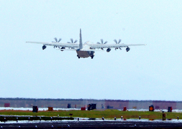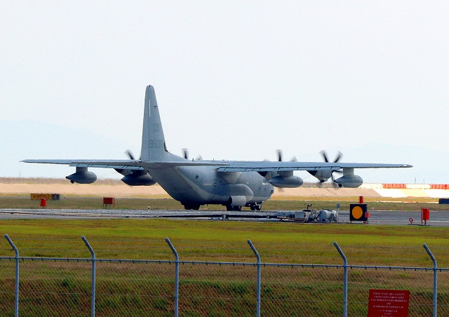 米海兵隊 KC-130J 空中給油機 スーパーハーキュリーズ(岩国基地)、QD 9532番機が離陸 |