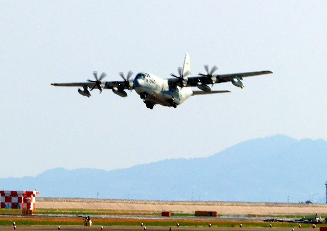 米海兵隊 KC-130J 空中給油機 スーパーハーキュリーズ(岩国基地)、QD 7983番機がタッチアンド・ゴーして旋回(5周目) |