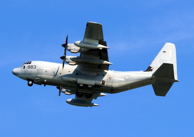 米海兵隊 KC-130J 空中給油機 スーパーハーキュリーズ(岩国基地)、QD 7983番機が旋回(5周目) |