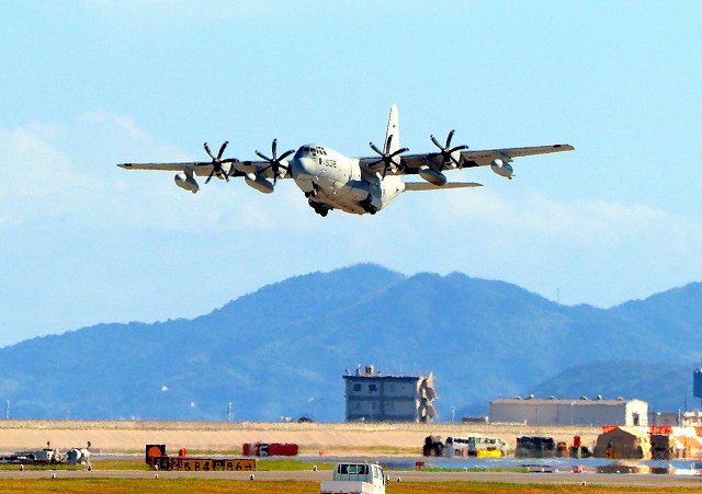 米海兵隊 KC-130J 空中給油機 スーパーハーキュリーズ(岩国基地)、QD 9532番機がタッチアンド・ゴーして旋回(1周目) |
