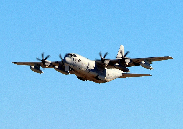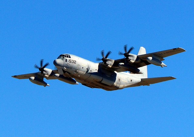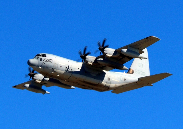 米海兵隊 KC-130J 空中給油機 スーパーハーキュリーズ(岩国基地)、QD 9532番機が旋回(1周目) |