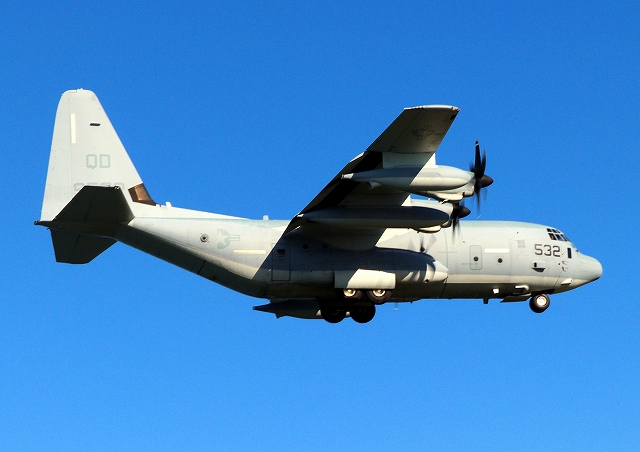 米海兵隊 KC-130J 空中給油機 スーパーハーキュリーズ(岩国基地)、QD 9532番機が旋回(5周目) |
