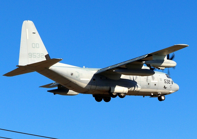 米海兵隊 KC-130J 空中給油機 スーパーハーキュリーズ(岩国基地)、QD 9532番機が着陸