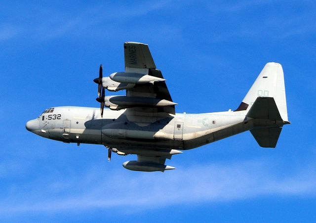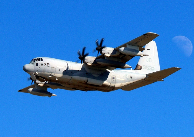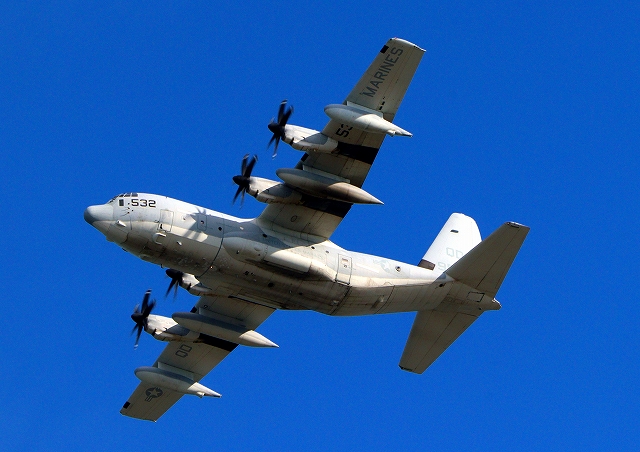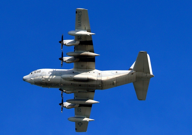 米海兵隊 KC-130J 空中給油機 スーパーハーキュリーズ(岩国基地)、QD 9532番機が旋回 |