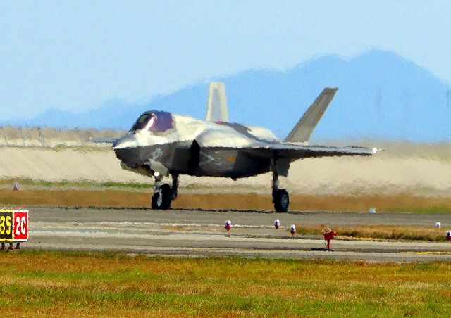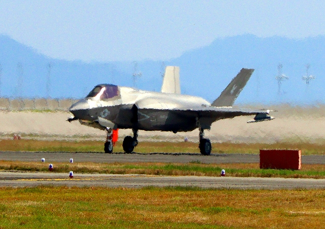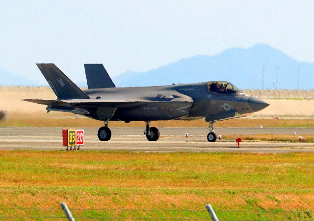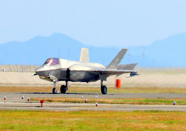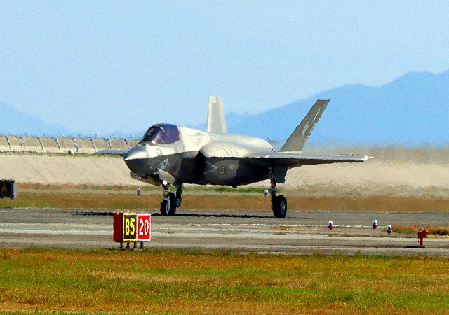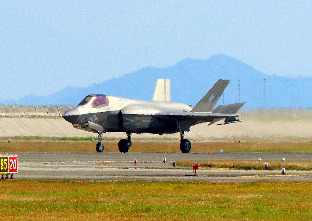 米海兵隊 F-35B ライトニングⅡ 戦闘機(岩国基地)、DT、25番機が着陸 |