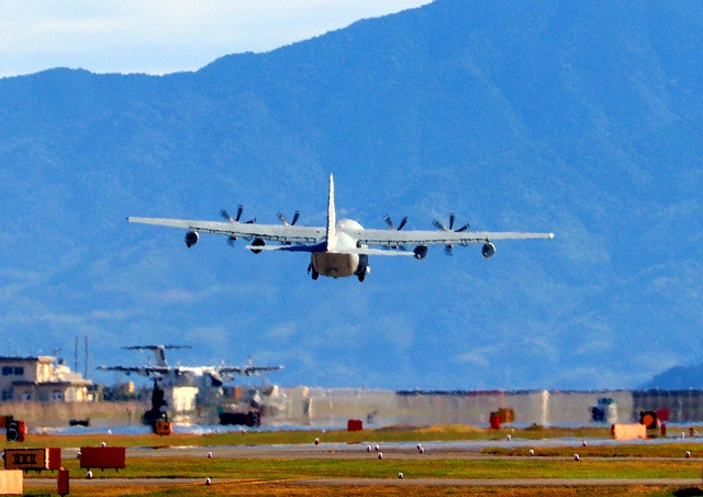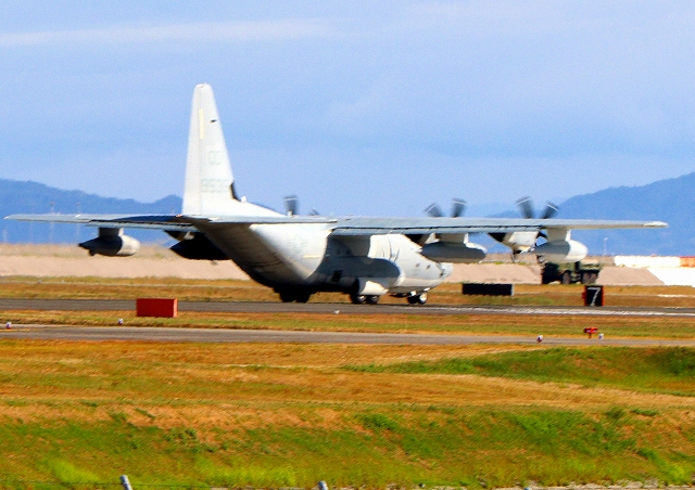 米海兵隊 KC-130J 空中給油機 スーパーハーキュリーズ(岩国基地)、QD 9535番機が離陸 |