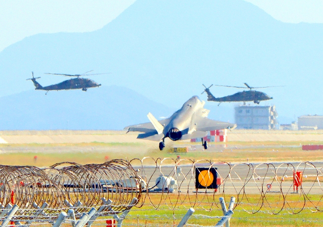 米海兵隊 F-35B ライトニングⅡ 戦闘機(岩国基地)、DT、29番機が着陸 陸上自衛隊 UH-60JA 多用途ヘリ、2機 |
