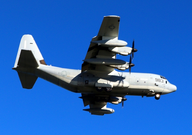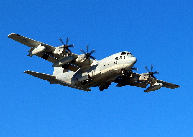 米海兵隊 KC-130J 空中給油機 スーパーハーキュリーズ(岩国基地)、QD 7983番が旋回機 |