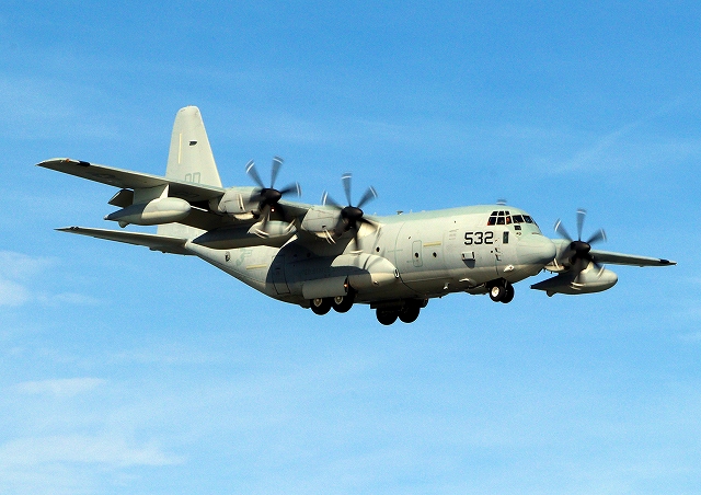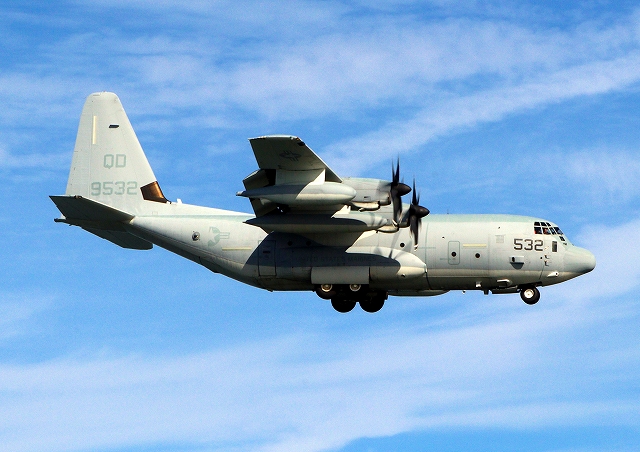 米海兵隊 KC-130J 空中給油機 スーパーハーキュリーズ(岩国基地)、QD 9532番機が旋回 |