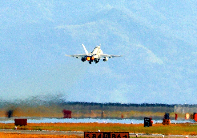 米海兵隊 F/A-18D ホーネット 戦闘攻撃機(岩国基地)、DR、947番機が離陸 |