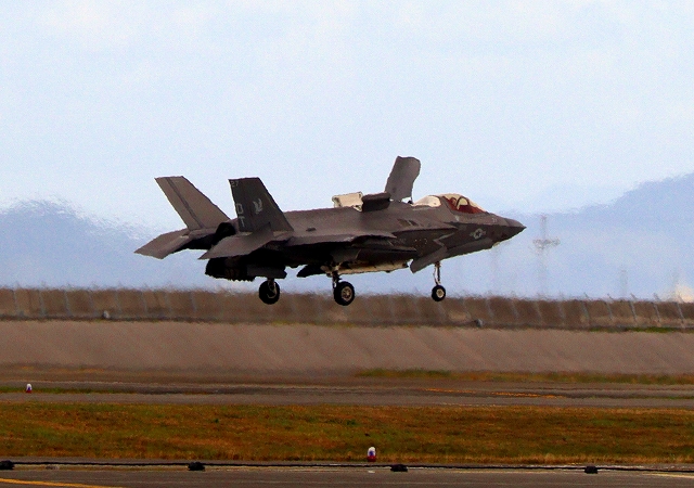 米海兵隊 F-35B ライトニングⅡ 戦闘機(岩国基地)、DT、27番機は垂直着陸パッドの上でホバリング |