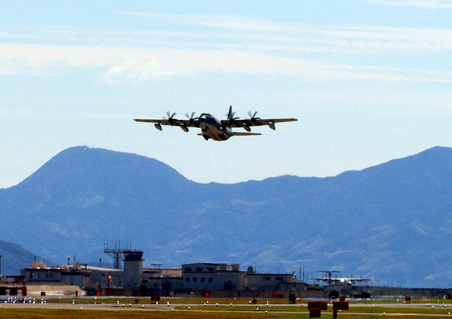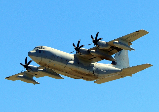 米海兵隊 KC-130J 空中給油機 スーパーハーキュリーズ(岩国基地)、QD 7111番機が離陸 |