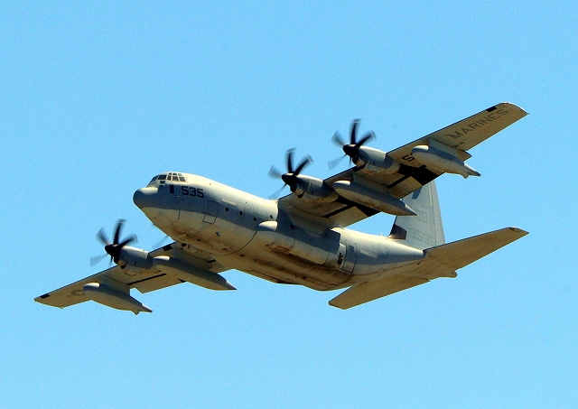 米海兵隊 KC-130J 空中給油機 スーパーハーキュリーズ(岩国基地)、QD 9535番機が離陸 |