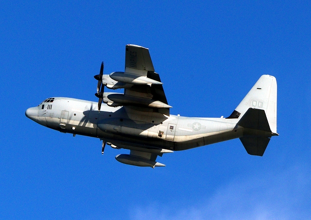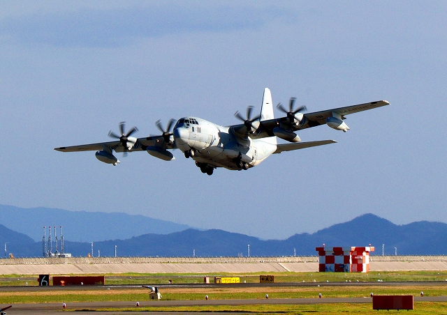 米海兵隊 KC-130J 空中給油機 スーパーハーキュリーズ(岩国基地)、QD 7111番機がタッチアンド・ゴーして旋回 |