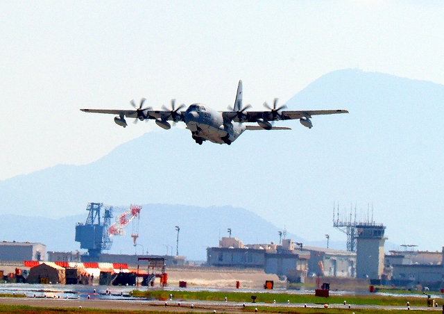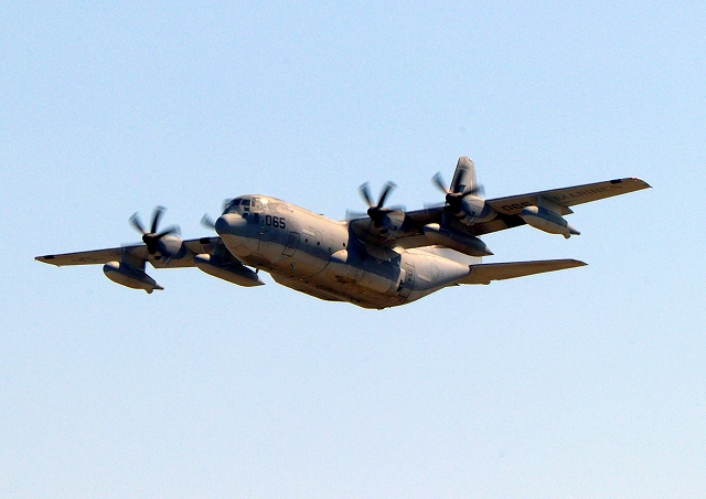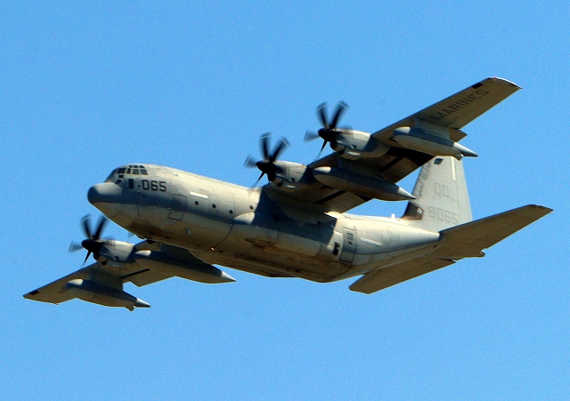 米海兵隊 KC-130J 空中給油機 スーパーハーキュリーズ(岩国基地)、QD 8055番機が離陸 |