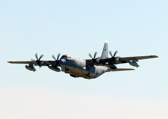 米海兵隊 KC-130J 空中給油機 スーパーハーキュリーズ(岩国基地)、QD 9532番機が離陸 |