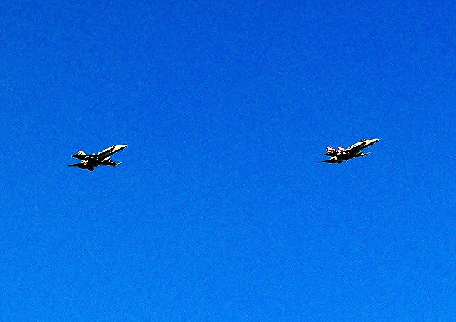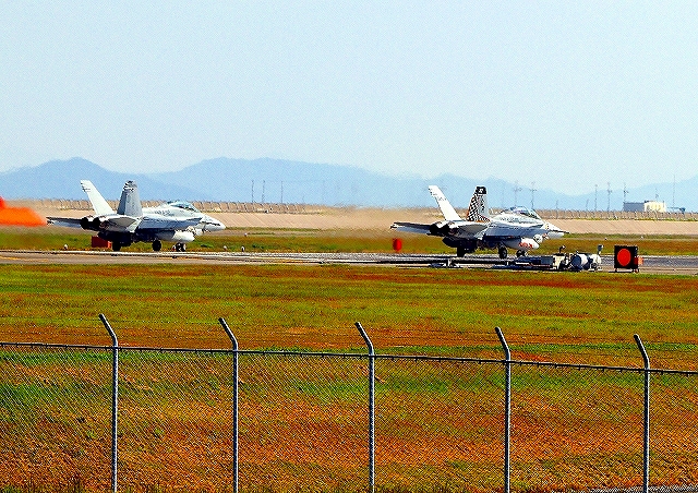 米海兵隊 F/A-18C ホーネット 戦闘攻撃機(岩国基地)、DR、214番機、WK、14番機が2機編隊で帰還 |