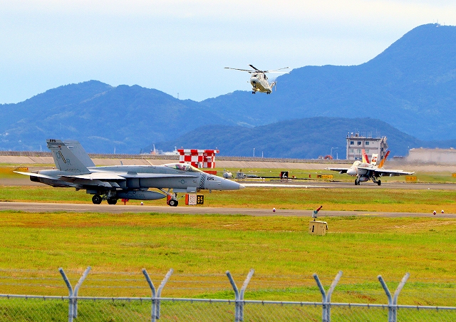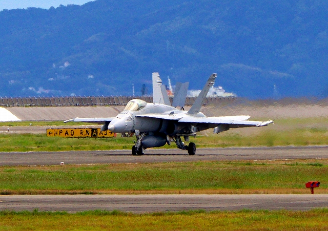 米海兵隊 F/A-18C ホーネット 戦闘攻撃機(岩国基地)、DR、312番機が着陸 |