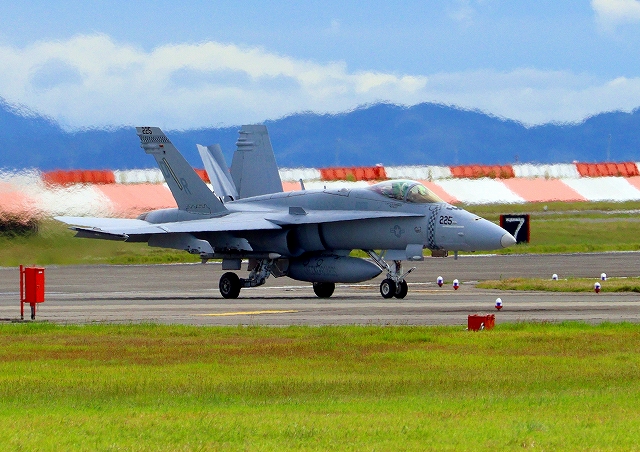 米海兵隊 F/A-18D ホーネット 戦闘攻撃機(岩国基地)、DR、225番機が着陸 |