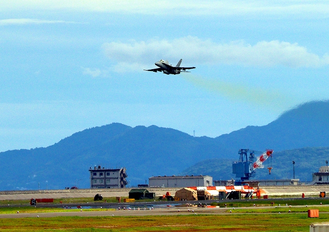 米海兵隊 F/A-18C ホーネット 戦闘攻撃機(岩国基地)、WK、02番機が離陸 |