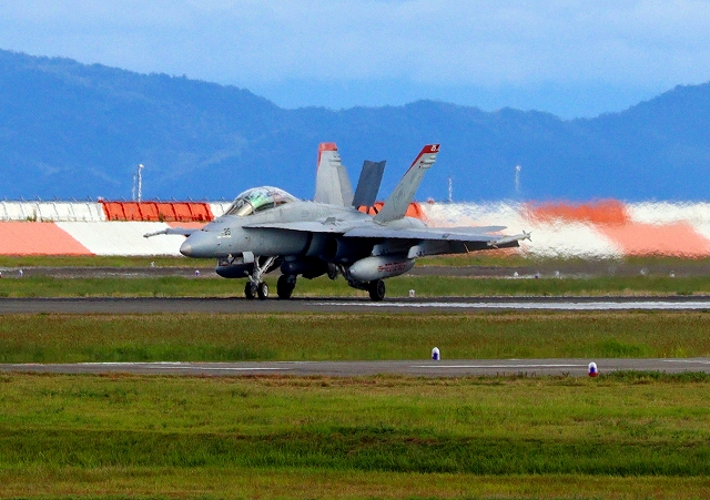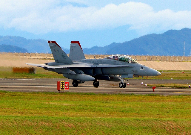 米海兵隊 F/A-18D ホーネット 戦闘攻撃機(岩国基地)、WT、25番機が着陸 14時27分に離陸した機。47分間の飛行でした。 |