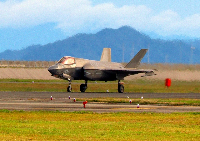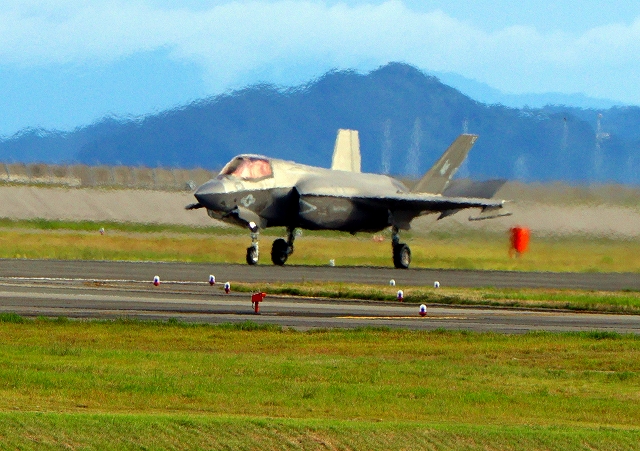 米海兵隊 F-35B ライトニングⅡ 戦闘機(岩国基地)、DT、21番機が着陸 14時27分に離陸した機。47分間の飛行でした。 |