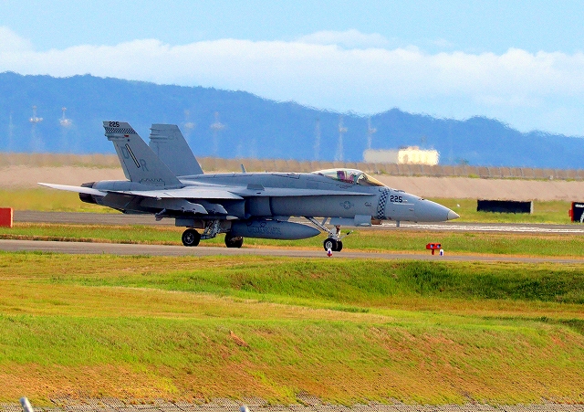 米海兵隊 F/A-18C ホーネット 戦闘攻撃機(岩国基地)、DR、225番機が着陸 14時32分に離陸した機。46分間の飛行でした。 |