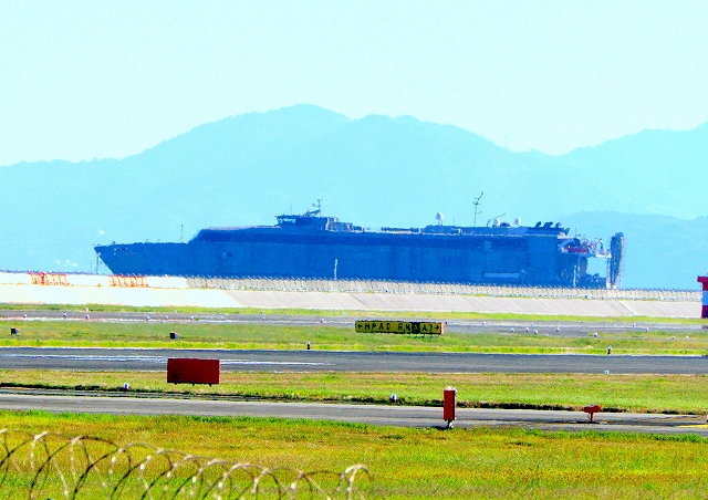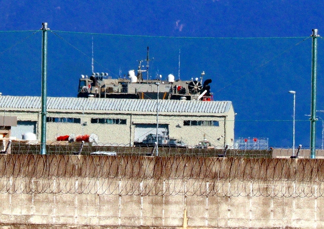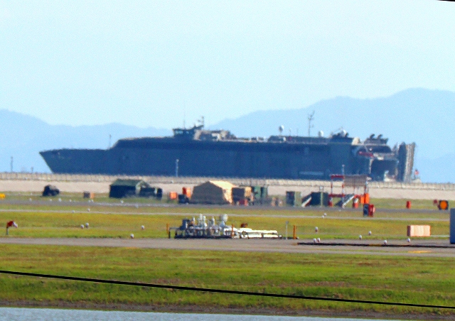 門前川対岸に行ってみたら、米海軍 高速輸送船 グアムの後部、裏側の一部がなんとかが見えました。 |