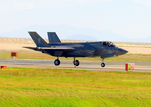 米海兵隊 F-35B ライトニングⅡ 戦闘機(岩国基地)、VK、10番機 13時34分に離陸した機。59分間の飛行でした。 |