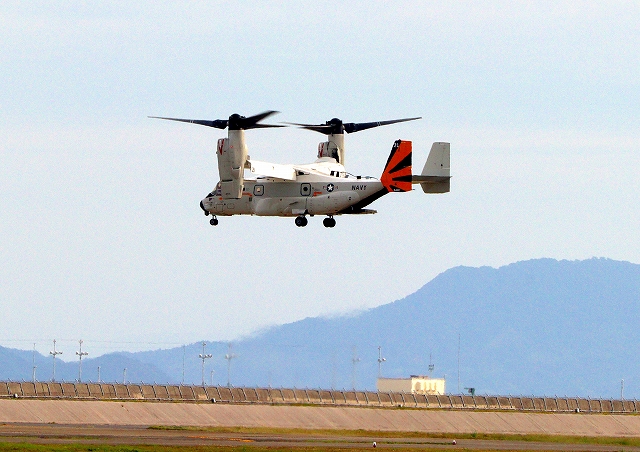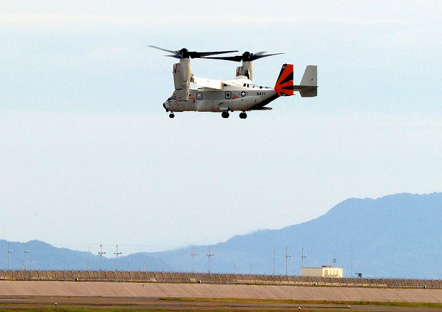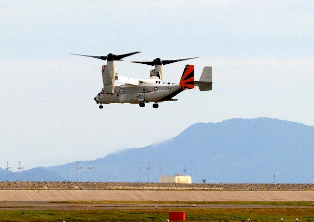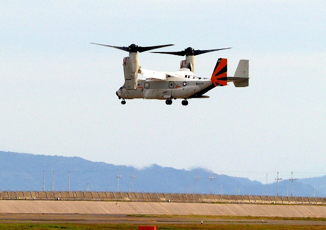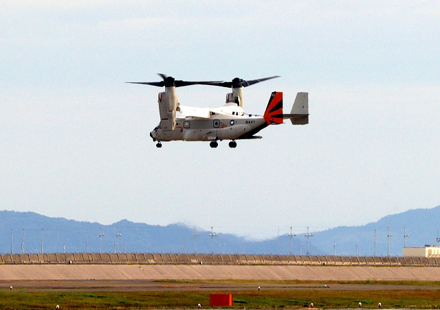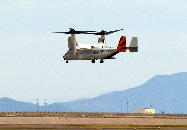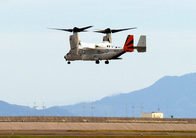 米海軍艦載機 CMV-22B オスプレイ、21ー9446番機が垂直着陸パッドの上でホバリング |