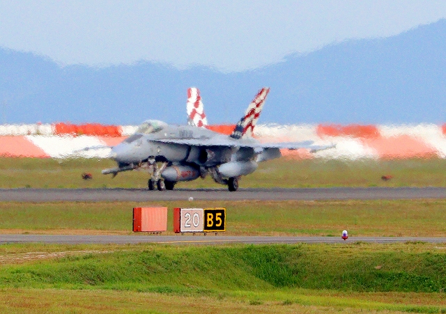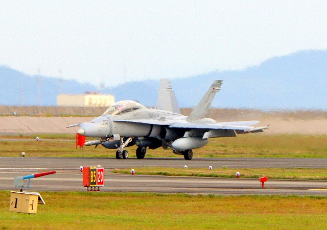米海兵隊 F/A-18C ホーネット 戦闘攻撃機(岩国基地)、DR、702番機が着陸 14時13分に離陸した機。1時間33分の飛行でした。 |