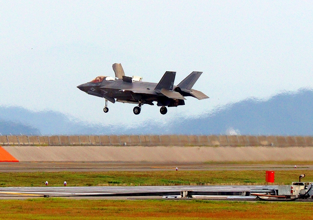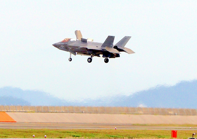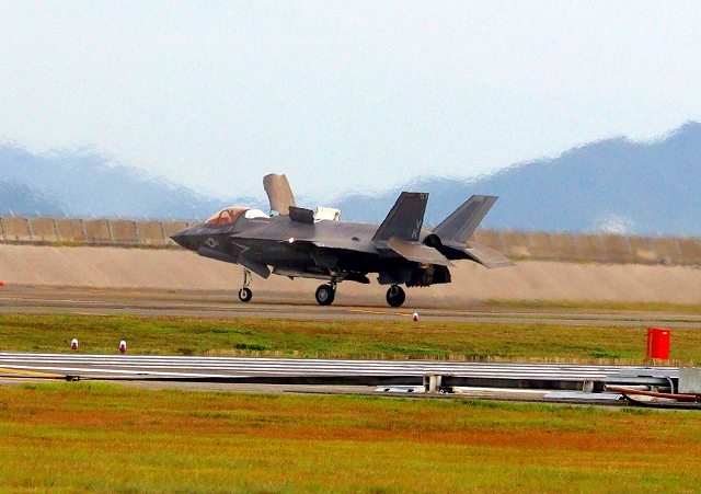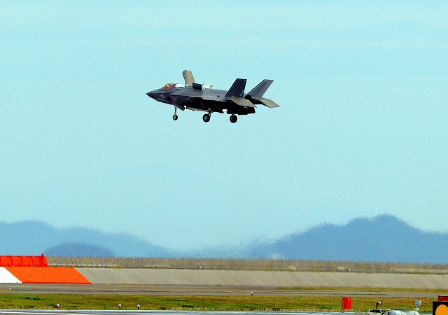 米海兵隊 F-35B ライトニングⅡ 戦闘機(岩国基地)、VK、07番機が帰還、垂直着陸パッドの上に着陸 14時 |