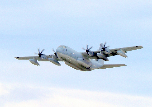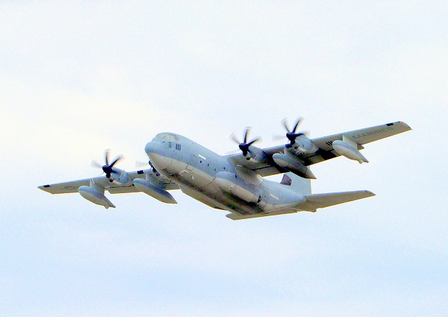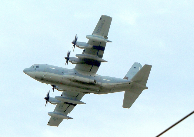 米海兵隊 KC-130J 空中給油機 スーパーハーキュリーズ(岩国基地)、QD 7111番機が離陸 |
