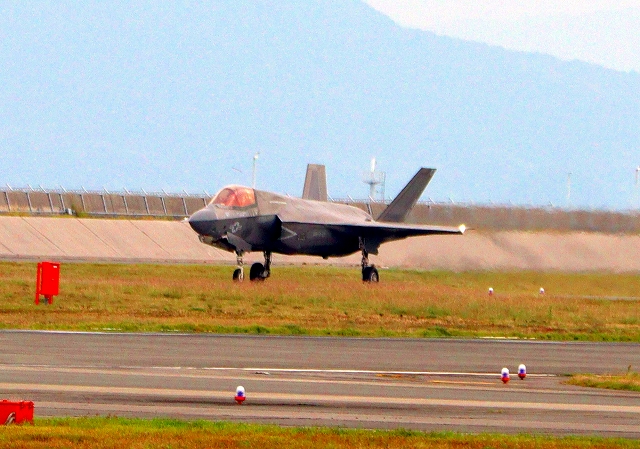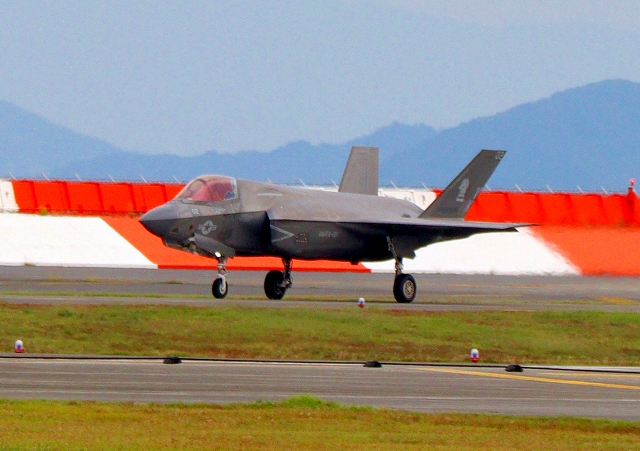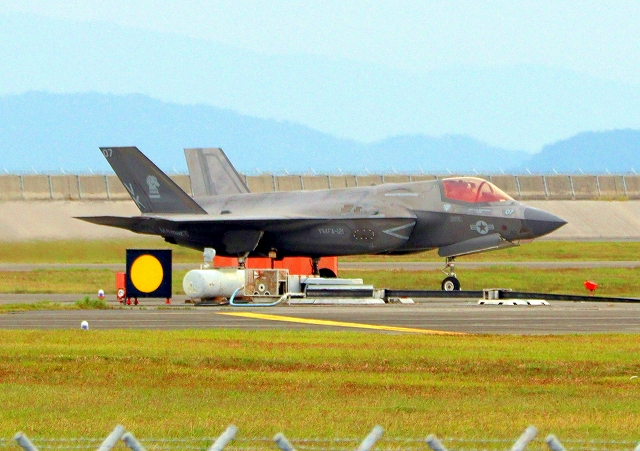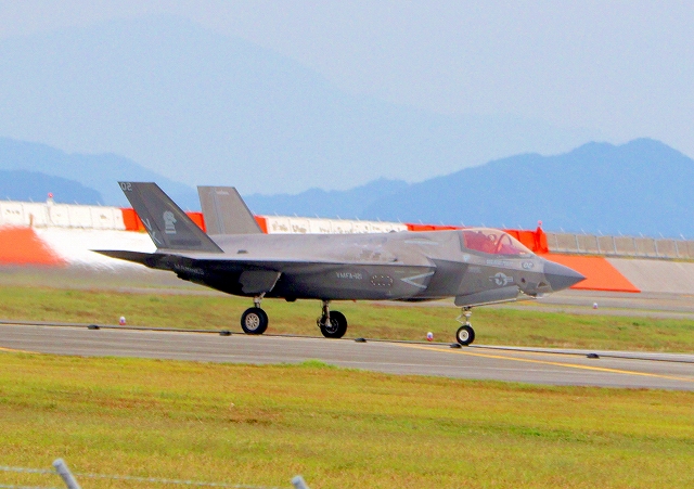 米海兵隊 F-35B ライトニングⅡ 戦闘機(岩国基地)、VK、02番機が着陸 28日に新田原基地に向けて離陸した機 |