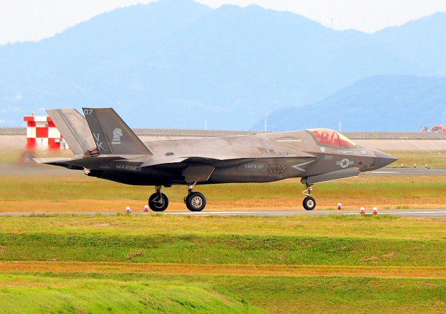 米海兵隊 F-35B ライトニングⅡ 戦闘機(岩国基地)、VK、07番機が着陸 28日に新田原基地に向けて離陸した機 |