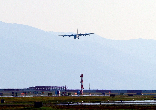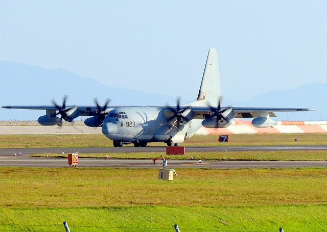 米海兵隊 KC-130J 空中給油機 スーパーハーキュリーズ(岩国基地)、QD 7923番機が着陸 |